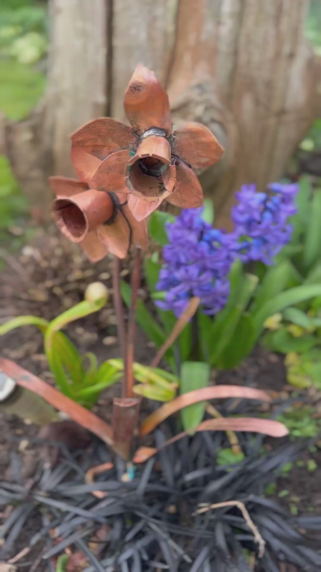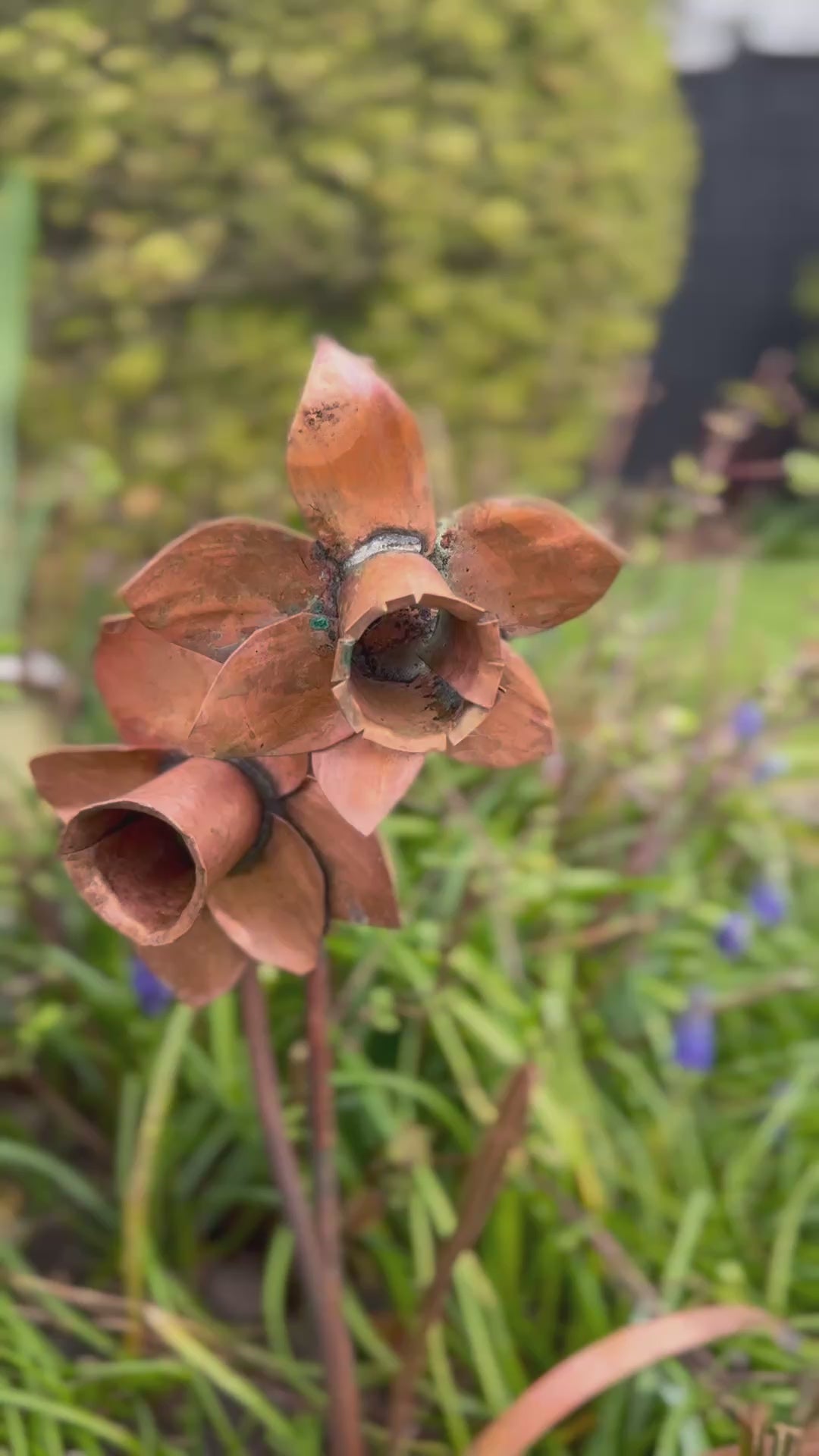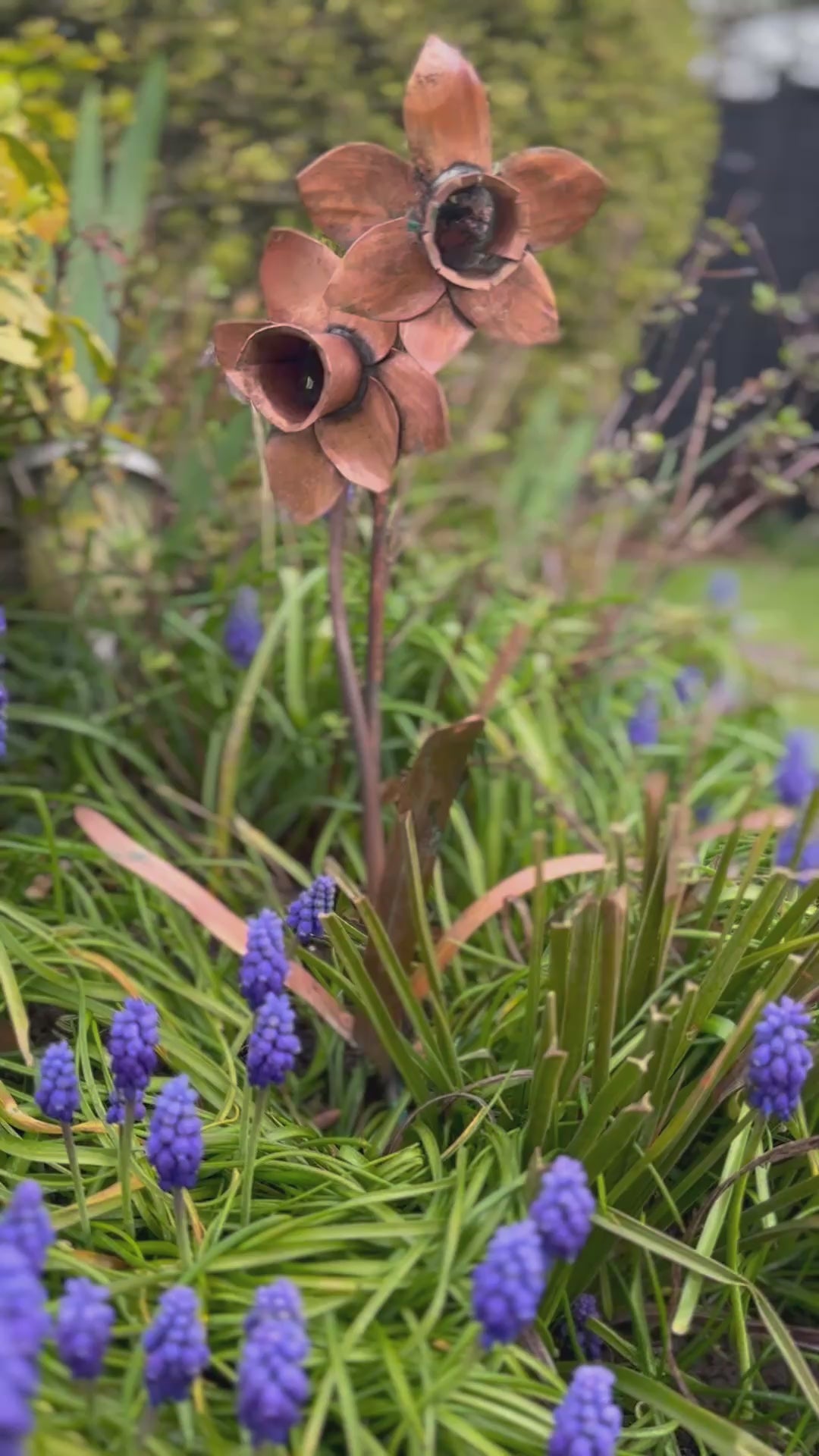 Two hand made copper daffodils with leaves. Have spike at the bottom to allow them to sit in flower beds. Can also be used indoors. Height approx 40cm.