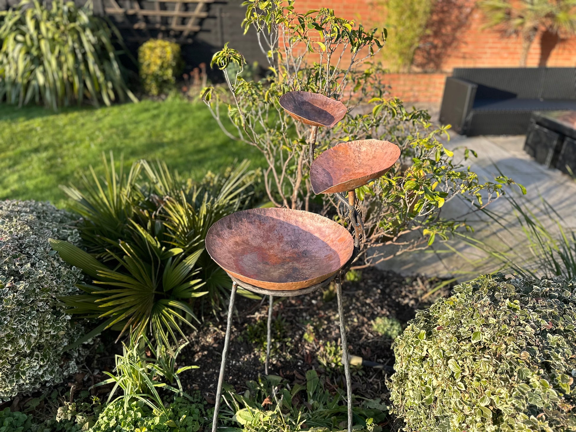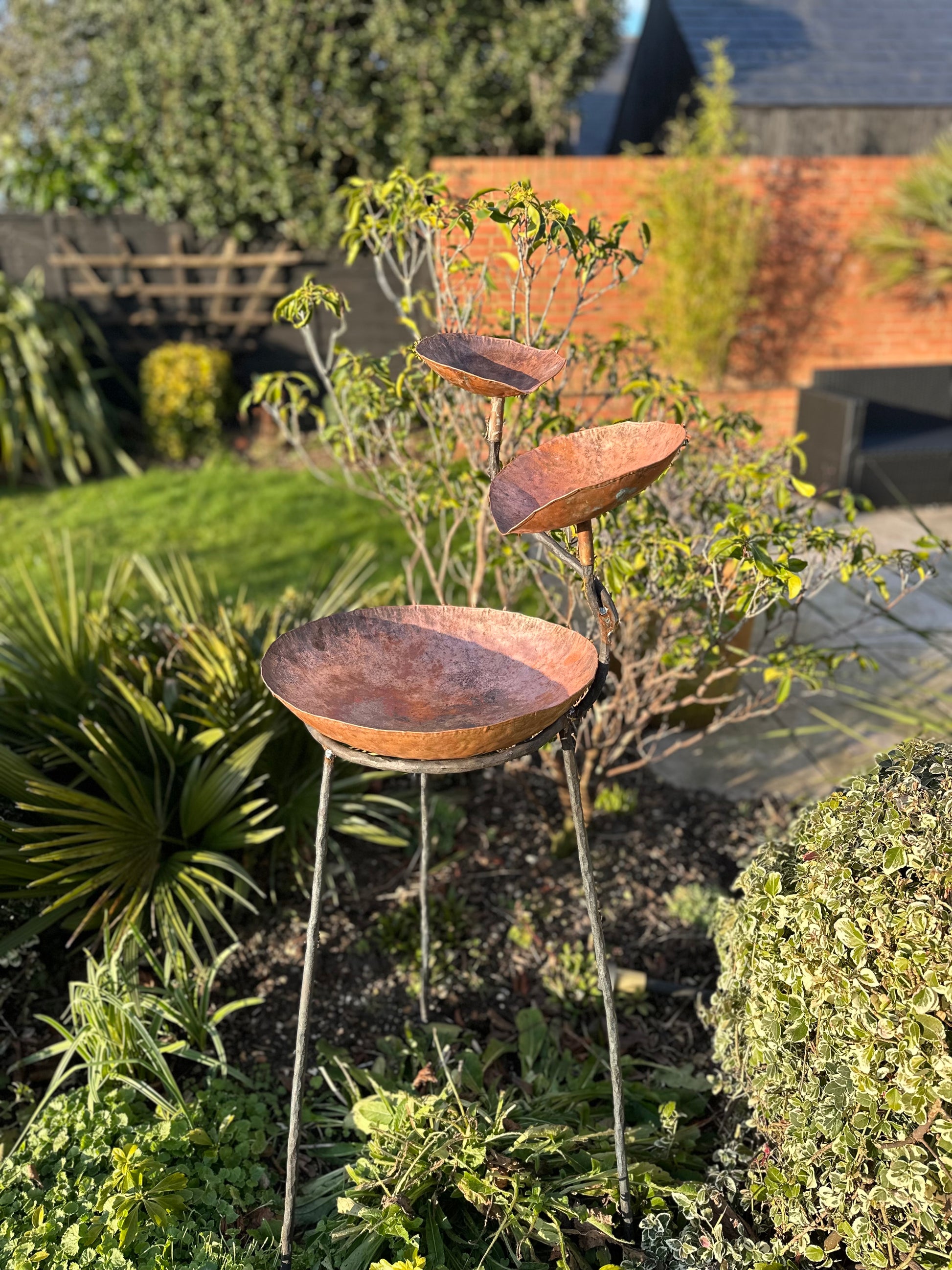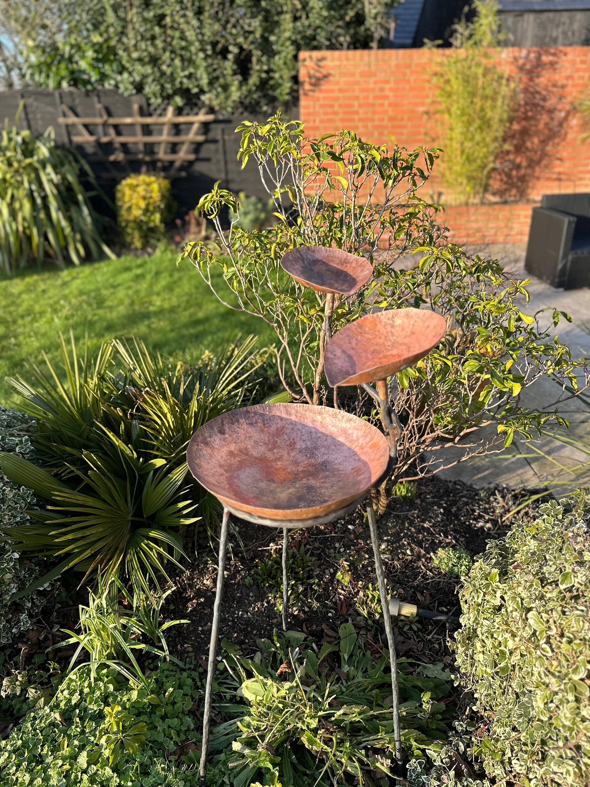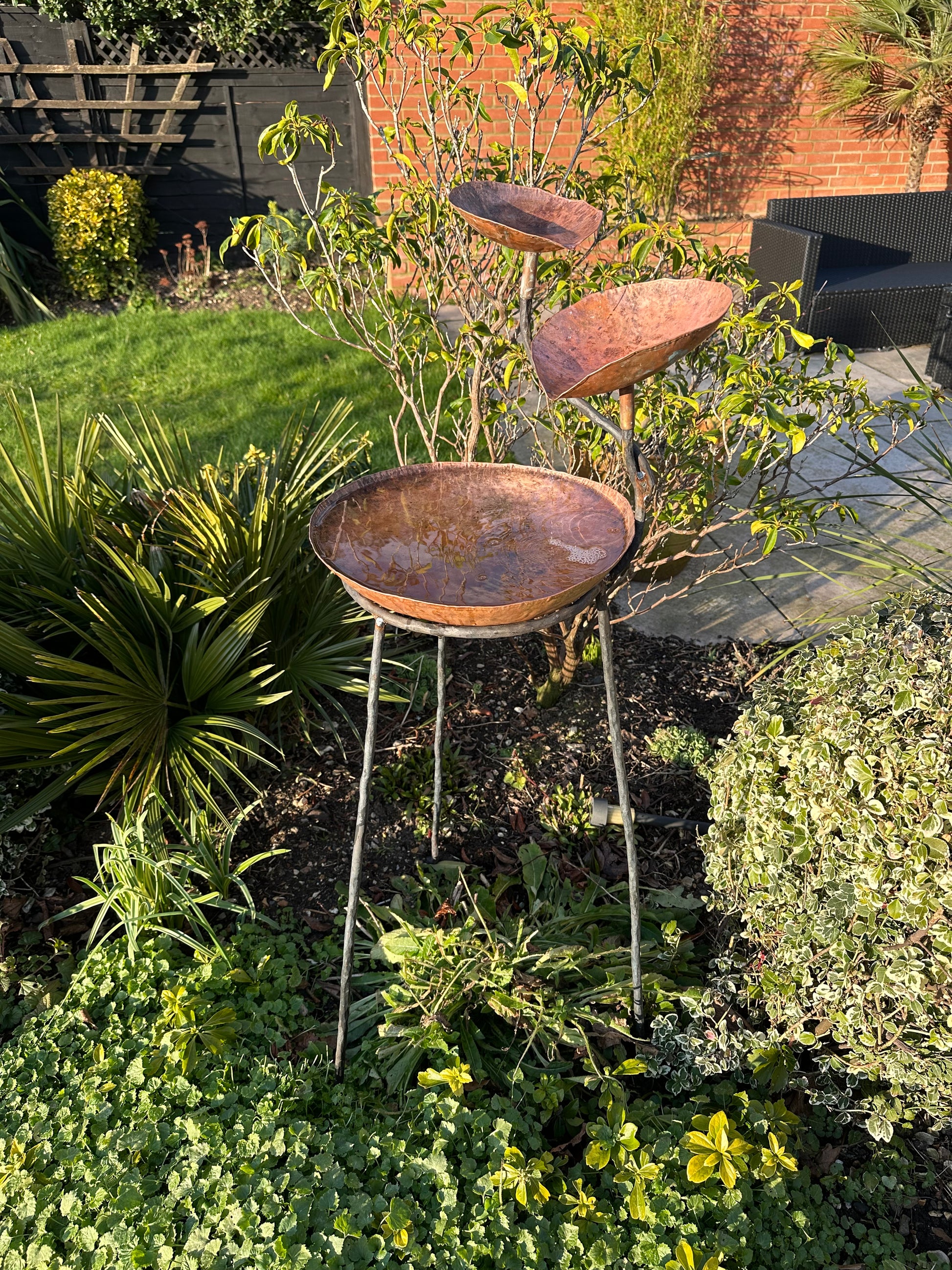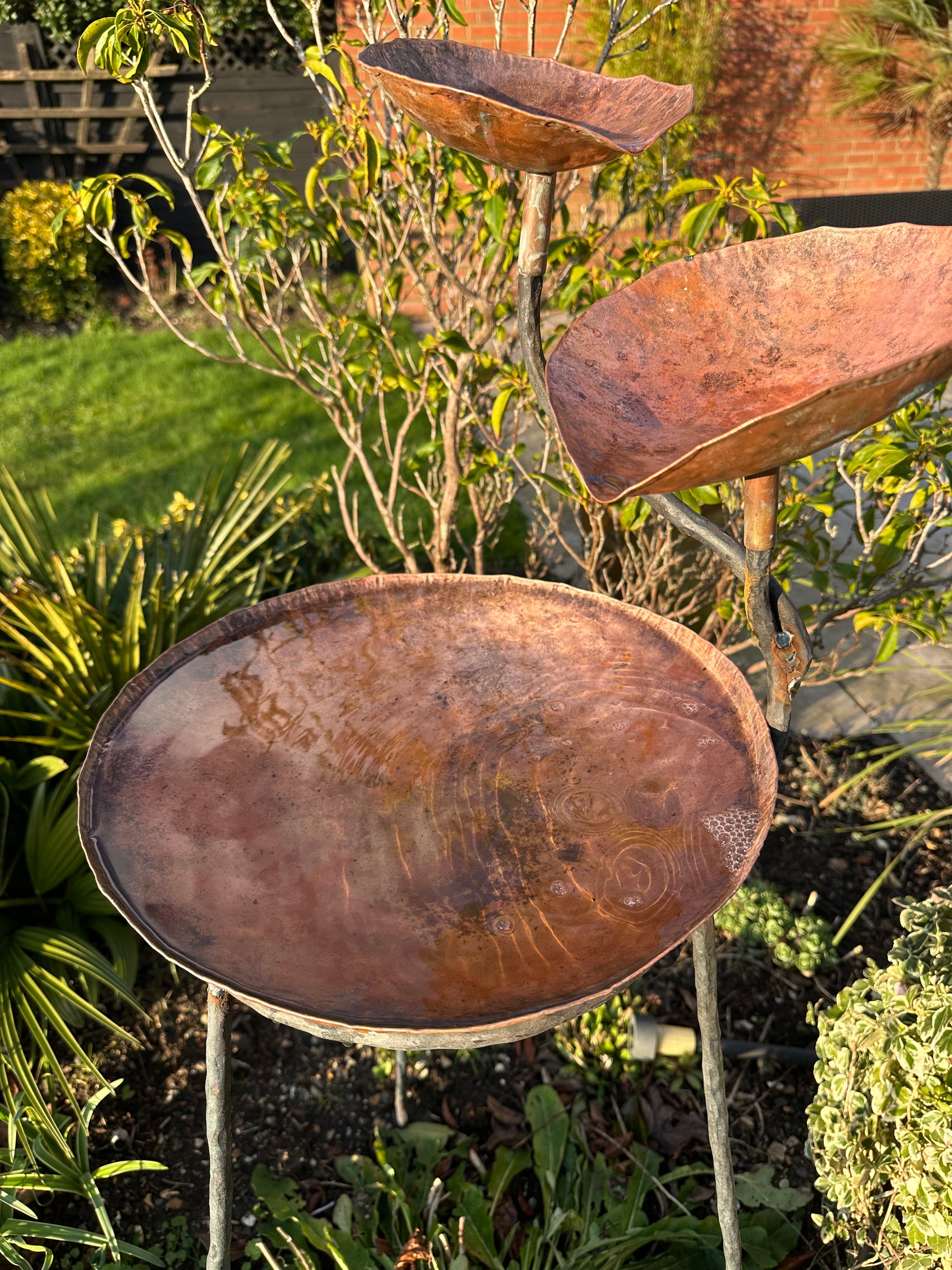 Tall three level copper water sculpture made from hammered copper and steel. This item was made in collaboration with a blacksmith.